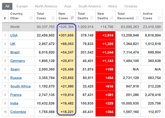 По состоянию на 8 января в мире за сутки диагностировали рекордные 826 тысяч новых заражений COVID-19. Умерло за последние сутки 14 788 ковид-больных.