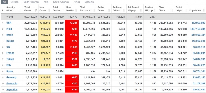 COVID-19 во всем мире диагностировали у более 90 млн человек, из них за сутки подтвердили 727 тысяч новых заражений.