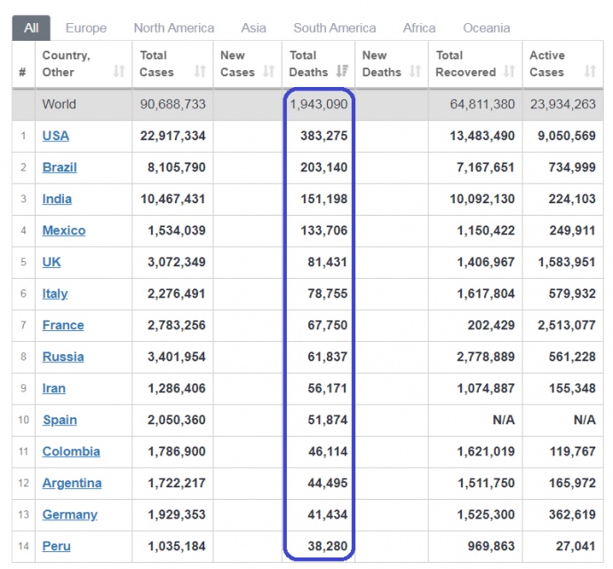 По состоянию на 10 январе в мире подтверждено 1 943 090 умерших от COVID-19, в том числе 8836 за последние сутки.