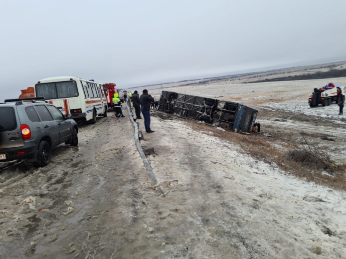 По предварительным данным водитель пассажирского автобуса (1973 года рождения) не справился с управлением и допустил опрокидывание транспортного средства.