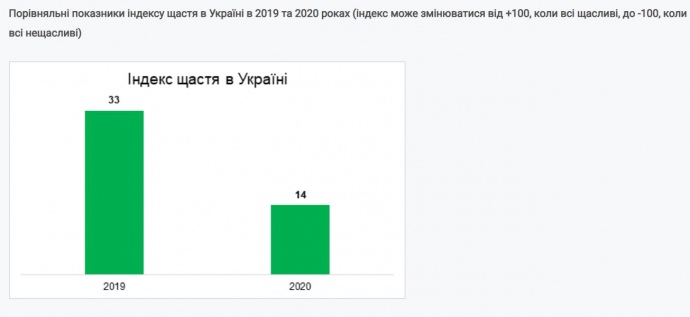 Отмечается, что в Украине он ниже, чем в мире. Кроме того, индекс счастья в Украине резко упал по сравнению с прошлым годом: в 2019 - 33%, в 2020 году - 14%.
