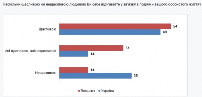 Количество счастливых украинцев (49%) все же больше, чем количество несчастливых (35%). За год количество счастливых практически не изменилась.