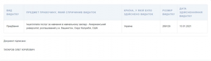 Детали :В документе указано, что 13 января Татаров оплатил обучение стоимостью 269 129 грн в Американском университете в Вашингтоне, округ Колумбия, США.