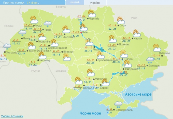 18-19 января в Украине температура ночью 17-22°, в северных и западных областях местами до 25° мороза, днем 10-15° мороза; на Закарпатье и крайнем юге страны ночью 10-15°, днем 5-10° с отметкой "минус", без существенных осадков.