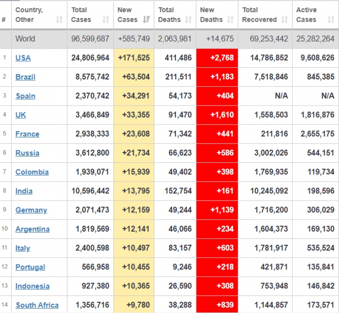 В общем число случаев заболевания уже достигло 96,6 млн. Смогли побороть недуг более 69,2 млн больных, умерли – 2 миллиона 65 тысяч человек.