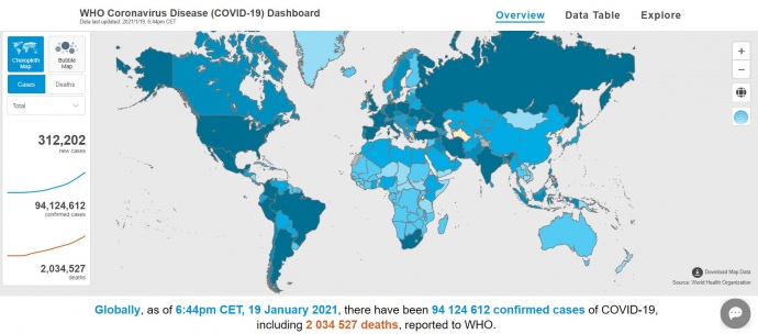 Таким образом, с начала пандемии совокупное число зарегистрированных случаев заболевания превысило 93 миллиона человек и более 2 миллионов случаев смерти во всем мире".