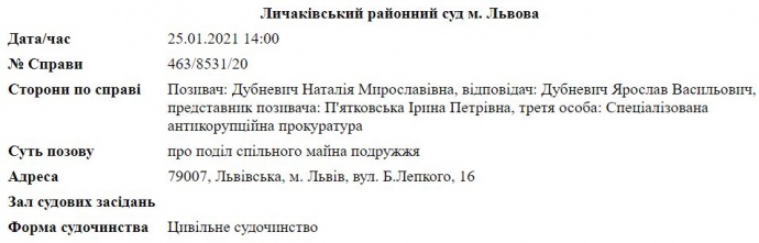 Жена Ярослава Дубневича, которого подозревают в хищении, просит Личаковский суд Львова разделить их общее имущество, потому что сами они не пришли к согласию относительно него.