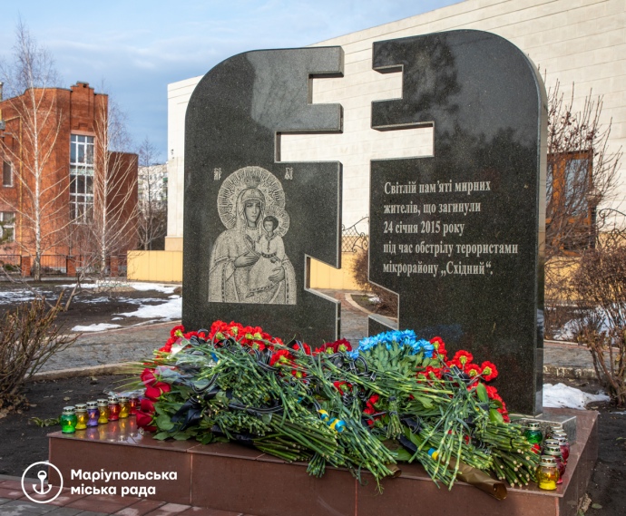 Дословно: "Сегодня в Мариуполе чтят память погибших во время обстрела микрорайона "Восточный" 24 января 2015 года. У памятного знака "Погибшим в необъявленной войне" прошла панихида. С утра к нему мариупольцы приносят цветы и лампадки. В 9:15 - время, когда произошел обстрел, в память о погибших прозвучали электросирены".