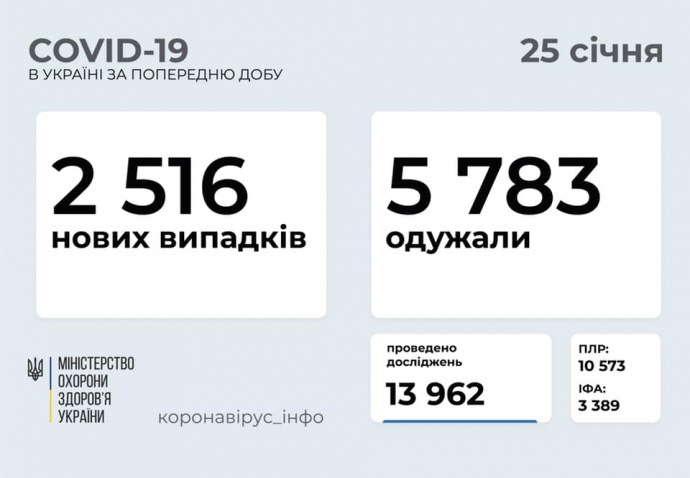 За сутки 24 января в Украине диагноз COVID-19 подтвердили 2 516 людям, госпитализировали 1 166 человек, не смогли спасти 63 больных, в то же время выздоровели 5 783 человека.