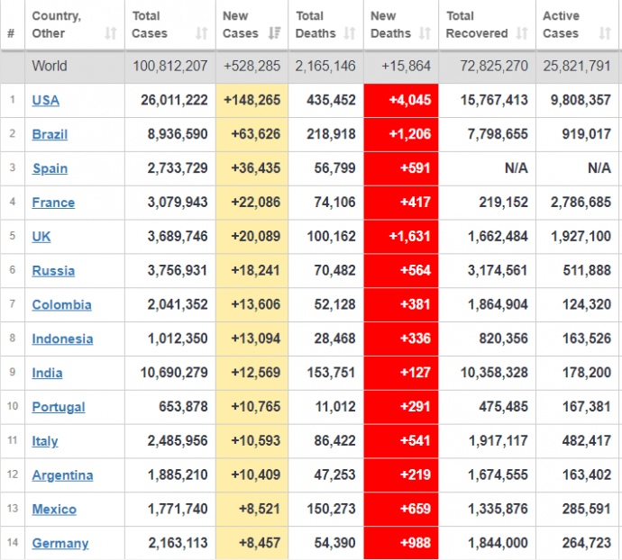 Только за минувшие сутки в мире подтвердили более 528 тысяч случаев заболевания коронавирусом, в общем – 100,8 млн заражений.