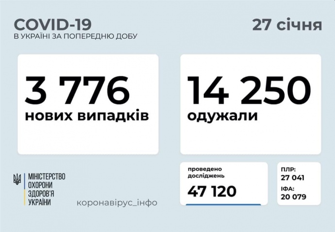 За сутки 26 января в Украине COVID-19 подтвердился у 3 776 человек, госпитализированы 2 430 больных, зафиксировали 145 летальных случаев, выздоровели 14 250 человек.