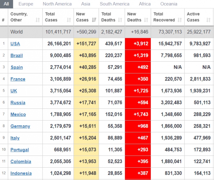 В общем от осложнений коронавируса умерли 2 миллиона 184 тысяч больных. Вылечились от COVID-19 уже 73,3 млн человек. Сейчас активными остаются почти 26 млн случаев.