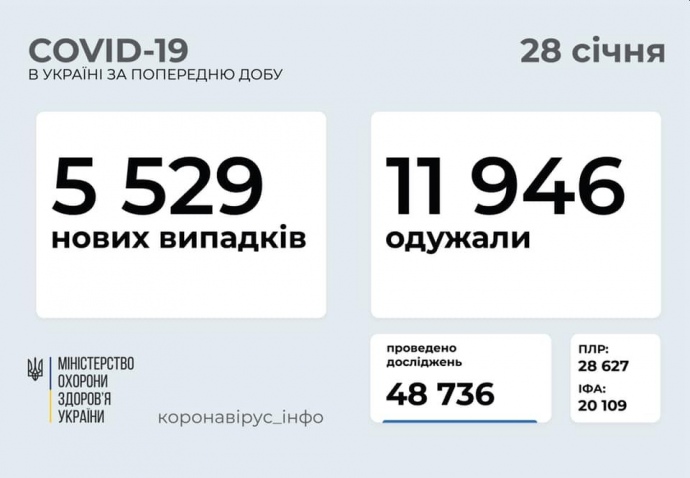 За сутки 27 января в Украине диагноз COVID-19 подтвердили 5 529 людям, госпитализировали 1 941 больного, не смогли спасти 149 пациентов, а выздоровели 11 946 человек.
