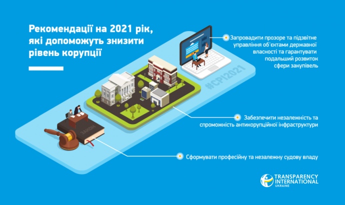 Украина заняла 117 место среди 180 стран в Индексе восприятия коррупции-2020, поднявшись в рейтинге на 3 балла.