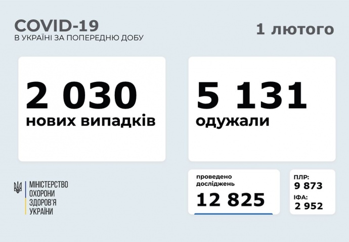 В воскресенье 31 января в Украине зафиксировали 2 030 новых случаев коронавирусной болезни COVID-19, госпитализировали за эти сутки 1 103 человека, летальных случаев – 61, выздоровел 5 131 человек.