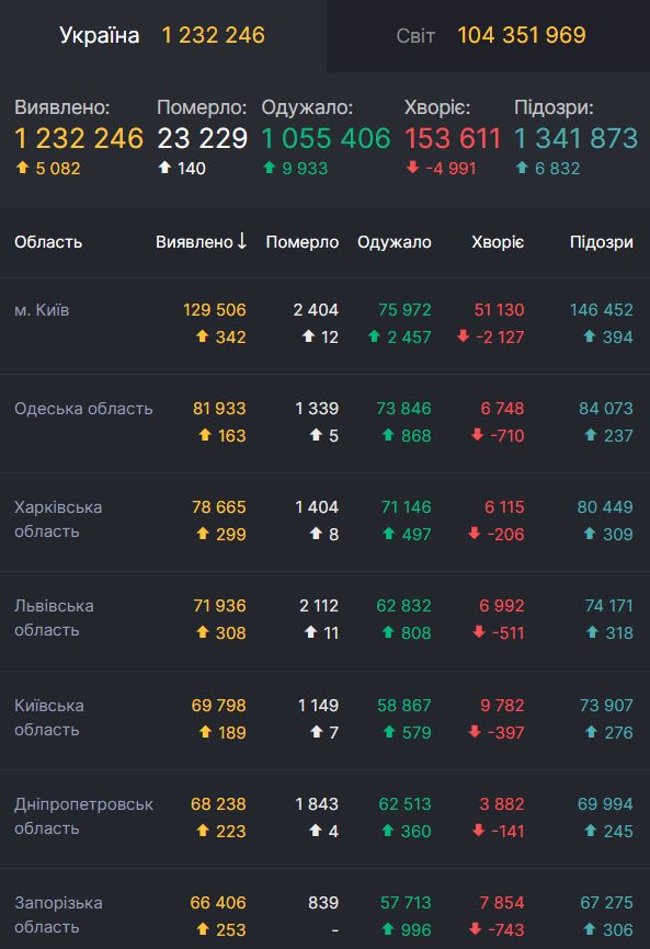 За все время пандемии в Украине было выявлено 1 232 246 случаев коронавирусного заболевания, уже выздоровели 1 055 406 человек, а умерли 23 229 человек.