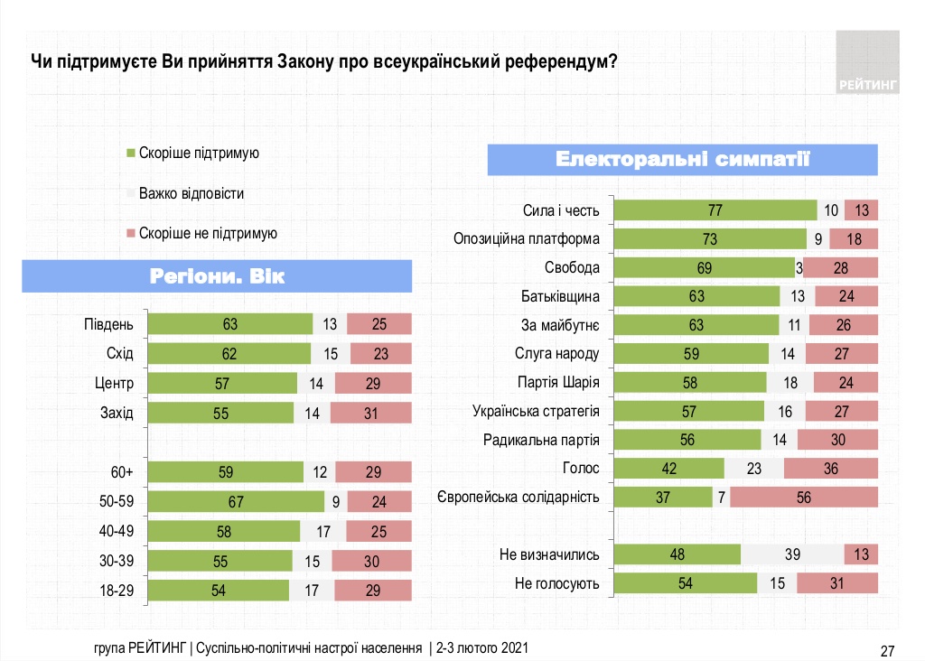 Больше всего поддерживают президентский закон о референдуме сторонники партий "Сила и честь" (77%) и "Оппозиционная платформа – За жизнь" (73%), а меньше всего – сторонники "Европейской солидарности" (37%) и "Голоса" (42%).