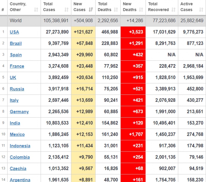 За это же время в мире от осложнений коронавируса умерли 14 286 человек. В общем, пандемия унесла жизни уже 2 миллионов 292 тысяч инфицированных.