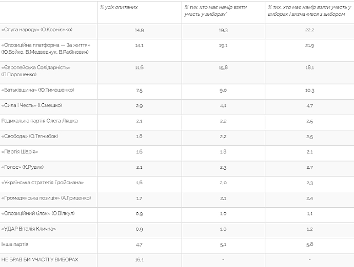Дословно: "Если бы в ближайшее время проходили выборы в Верховную Раду, наибольшую поддержку избирателей получили бы политическая партия" Слуга народа "(за нее готовы отдать свой голос 15% всех опрошенных или 22% тех, кто примет участие в выборах и определился, за какую партию голосовать) и партия "Оппозиционная платформа - За жизнь" (соответственно 14% и 22%)".