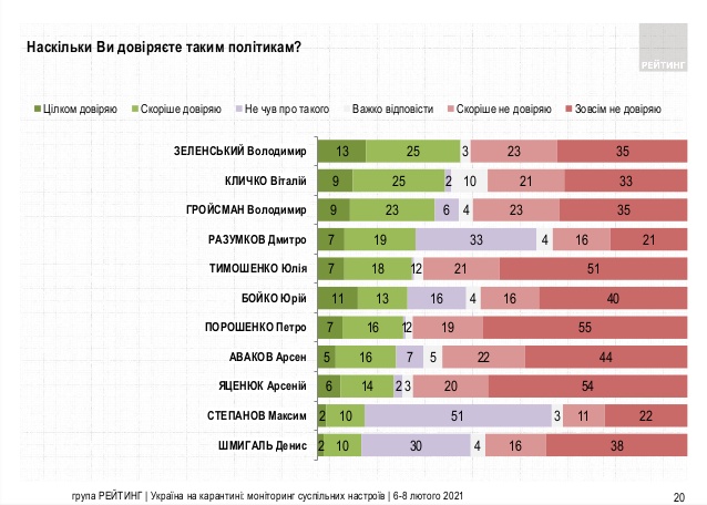 Согласно опросу социологической группы "Рейтинг", украинцы больше всего доверяют президенту Владимиру Зеленскому и мэру Киева Виталию Кличко, меньше всего – министру здравоохранения Максиму Степанову и премьеру Денису Шмыгалю.