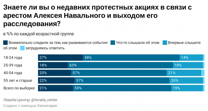 Вместе с тем 80% опрошенных знают о недавних протестах в связи с арестом Алексея Навального. Больше других за протестами наблюдали респонденты 18-24 лет (27%).