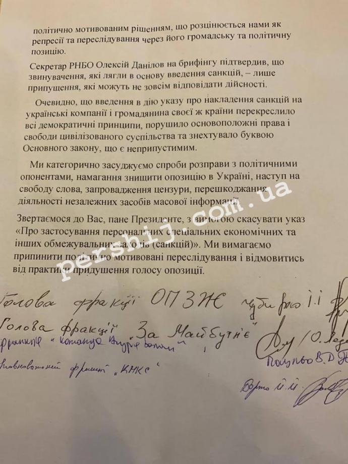 Они обвинили президента в нарушении законодательства и цензуре, а наложение персональных санкций на Тараса Козака назвали "репрессиями и преследованием" по политическим мотивам.