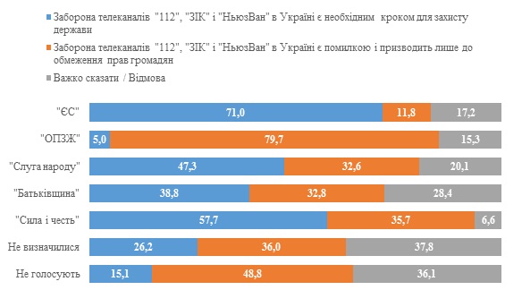 Дословно: "Половине респондентов задавался вопрос "2 февраля президент Владимир Зеленский и СНБО приняли решение о запрете трансляции телеканалов "112", "ЗИК" и "НьюзВан". Вы поддерживаете или не поддерживаете это решение?". В такой формулировке 43% поддерживают решение, не поддерживают – 40,3%".