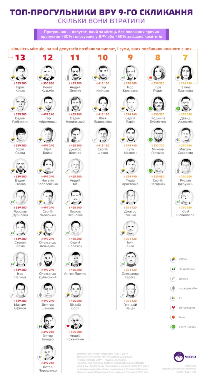 В течение 13 месяцев восемь народных депутатов ежемесячно попадали в перечень прогульщиков. Это Тарас Козак, Вадим Рабинович, Юрий Солод, Вадим Столар, Ярослав Дубневич, Степан Ивахив, Игорь Палица, Максим Ефимов. Каждого из них лишили выплат на 539 280 грн. Общая сумма потерянных ими средств - 4,3 миллиона гривен.