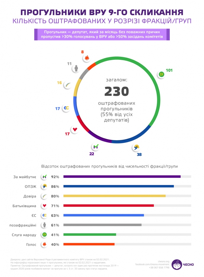Впрочем, отмечается, что по количеству депутатов, которых хотя бы раз штрафовали за прогулы, лидером является фракция "Слуга народа". Эта фракция является наибольшей в парламенте. На втором месте - ОПЗЖ, на третьем - "За майбутне".
