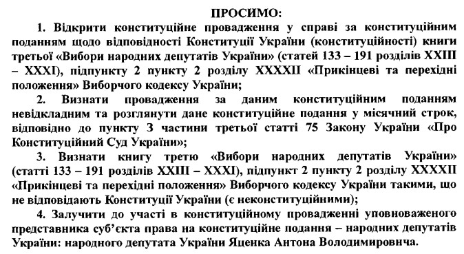 Дословно: "Авторы ходатайства просят признать книгу третью "Выборы народных депутатов Украины" (статьи 133 - 191 разделов ХХИИ - ХХХИ), подпункт 2 пункта 2 раздела ХХХХII "Заключительные и переходные положения" Избирательного кодекса Украины такими, которые не отвечают Конституции Украины".