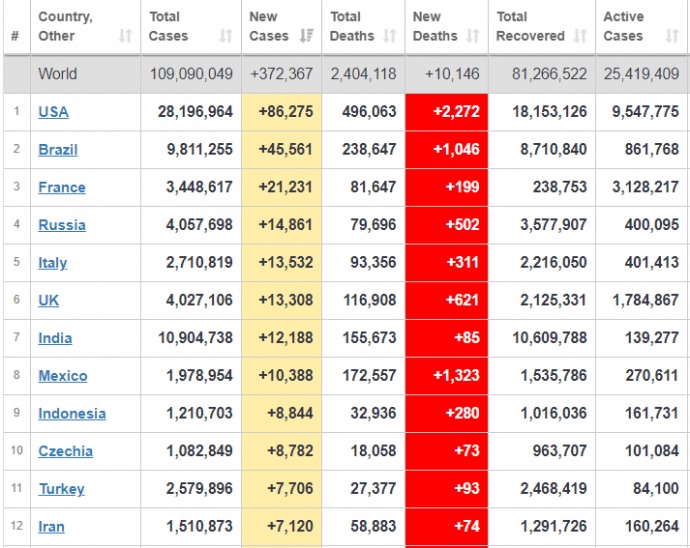 За все время пандемии погибли от COVID-19 уже 2 миллиона 404 тысячи больных. Вылечились от недуга 81,2 млн человек. Сейчас насчитывается около 25,4 млн активных случаев заболевания.