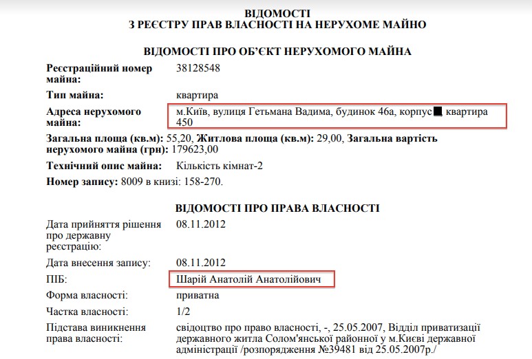 Как свидетельствует реестр прав на недвижимое имущество, Шарий действительно владеет квартирой на улице Вадима Гетьмана, но в доме под другим номером: не 43А, а 46А.