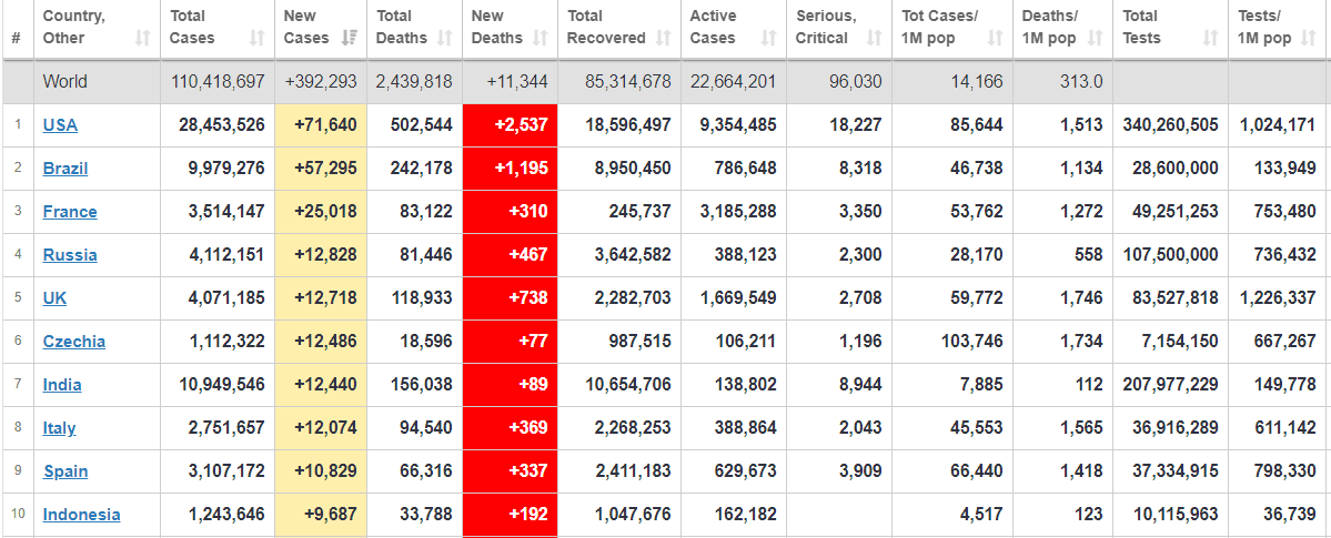 12 828 случаев обнаружили в РФ, несколько меньше - 12 718 - в Великобритании. Кроме того, 12 486 новых случаев - в Чехии. В то же время, Россия отчитывается о 467 смертях в сутки от коронавируса, а Великобритания - о 738 жертвах. В Чехии хотя и обнаружили такое же количество больных, однако констатировали 77 летальных случаев от COVID-19 за указанный период.