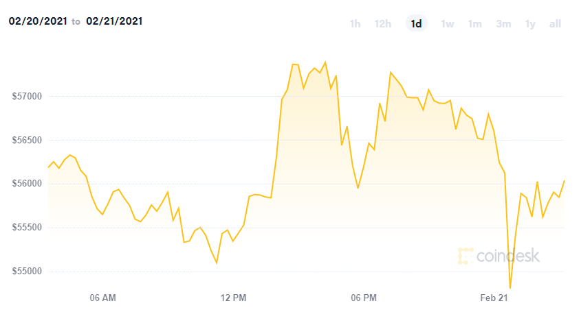 Детали: Согласно данным криптовалютой биржи Coindesk, по состоянию на 3:20 21 февраля стоимость одного биткоина составляет $55 995.