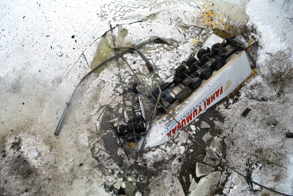 Дословно: "21 февраля на автомобильной дороге М-01" Киев-Чернигов-Новые Яриловичи "возле села Шестовица грузовой автомобиль с прицепом Mercedes-Benz Actros, разрушив конструктивные элементы ограждения моста и отбойника, упал с почти 20-метровой высоты в Десну и частично затонул. Водитель 1990 года рождения, гражданин Турции, погиб".