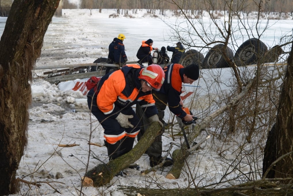 Детали: Спасатели расчистили берег реки, водолазы ГСЧС обследовали затонувшее транспортное средство, закрепили тросы, а с помощью автокрана и автомобиля "КрАЗ" грузовик с погибшим водителем вытащили из воды.