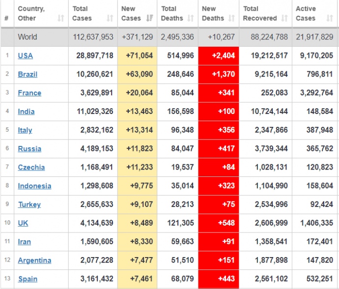 Детали: В частности, в США зафиксировали более 71 000 новых заражений, в Бразилиии - более 63 000, во Франции - более 20 000.