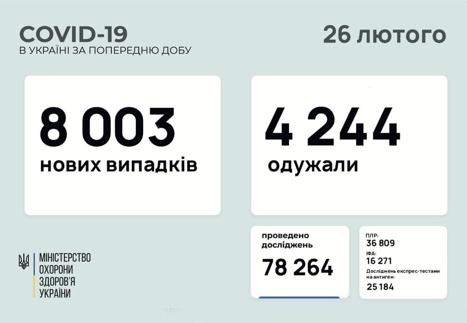 За сутки 25 февраля в Украине диагностировали 8 003 новых случаев коронавирусной болезни COVID-19, в больницы положили 2 762 больных, умерли 146 пациентов, выздоровели 4 244 человека.