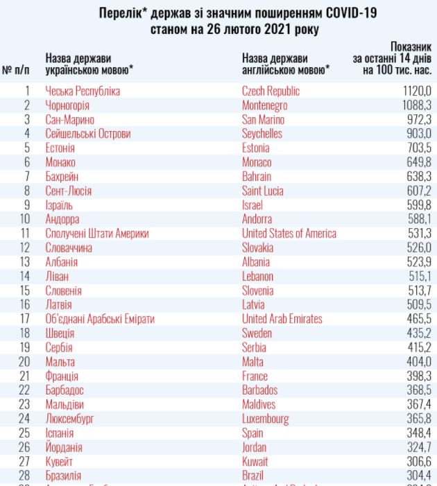 В "красную зону" включают страны с показателем заболеваемости на 100 тыс. населения за последние 14 дней выше, чем в Украине. В Украине этот показатель сейчас составляет 186,4.