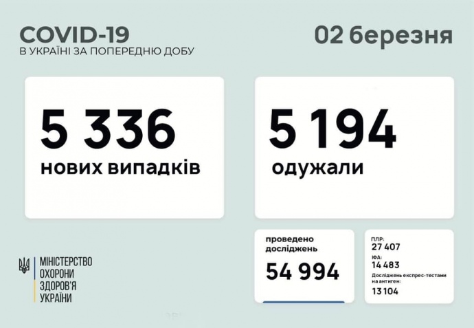 За сутки 1 марта диагноз COVID-19 в Украине поставили 5 336 лицам, госпитализировали 1 410 больных с коронавирусом или подозрением на него, умерли 162 человека, выздоровели 5 194 человека.