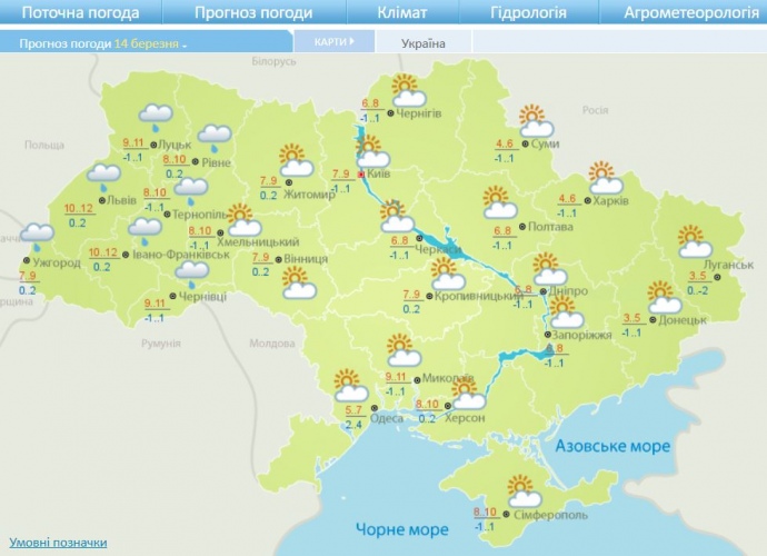 В воскресенье, 14 марта, атмосферный фронт с северо-запада Европы принесет дожди в западные области. В Карпатах - снег и мокрый снег. На остальной территории будет преобладать сухая погода.