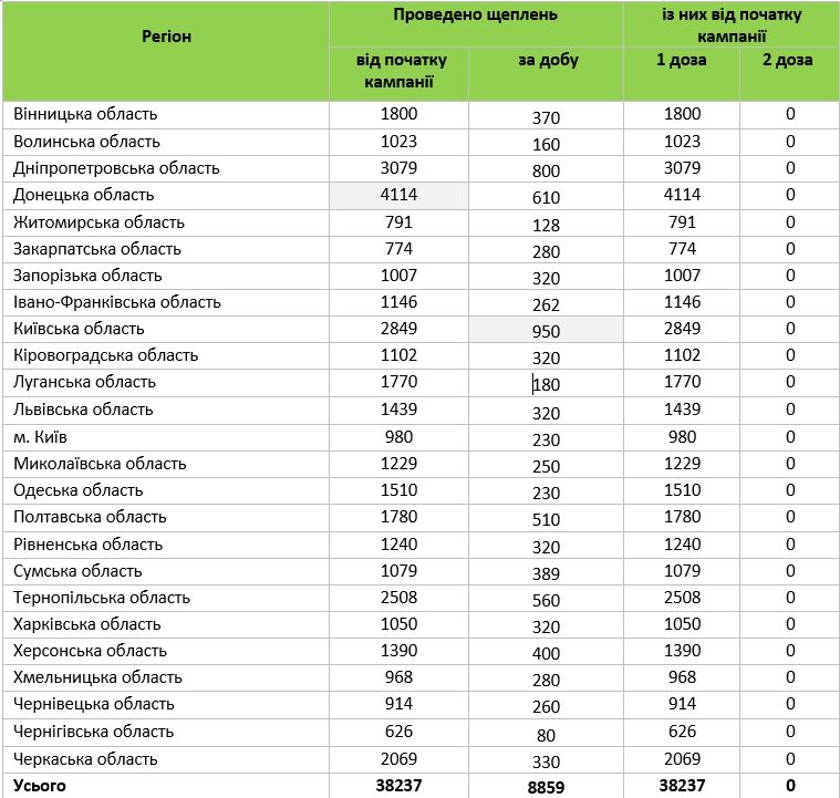 Детали: Всего с начала кампании по вакцинации, то есть с 24 февраля, привито 38 237 жителей Украины, все они получили первую дозу вакцины из двух необходимых.
