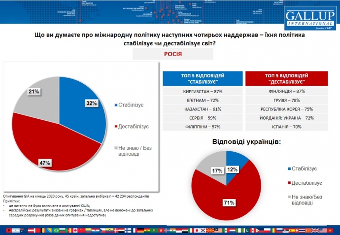 Около половины ответов описывают Россию как государство, которое несет дестабилизирующие риски. В Украине отрицательный показатель один из самых высоких - 71%. Треть в мире разделяет противоположное мнение (в Украине только 12%).