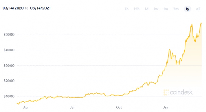 Детали: 13 марта стоимость одного биткоина достигла $61 089.