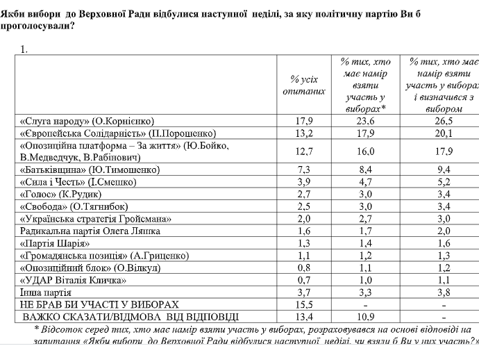 Партию "Сила и честь" готовы поддержать соответственно 4% и 5% респондетов, партию "Голос" - соответственно 3% и 3%, ВО "Свобода" - соответственно 2,5% и 3%, партию "Украинская стратегия Гройсмана" - соответственно 2% и 3%, Радикальную партию Олега Ляшко - соответственно 2% и 2%, "партию Шария" - соответственно 1% и 2%, партию "Громадянська позиція" - соответственно 1% и 1%, партию "Оппозиционный блок" - соответственно 1% и 1%, партию "УДАР Виталия Кличко" - соответственно 1% и 1%.