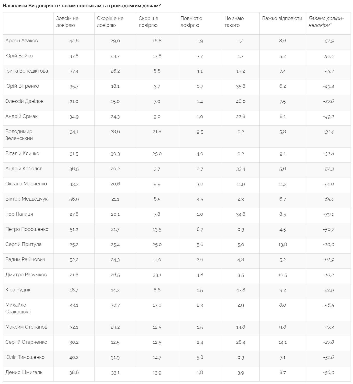 Чаще всего респонденты выражают недоверие Виктору Медведчуку (78%, тогда как доверяют ему 13%), Вадиму Рабиновичу (соответственно 76,5% и 14%), Михэилу Саакашвили (соответственно 74% и 15%), Петру Порошенко ( 73% и 22 %), Денису Шмыгалю (72% и 16%), Арсену Авакову (72% и 19%), Юлии Тимошенко (72% и 20,5%), Юрию Бойко (71,5% и 21,5 %).