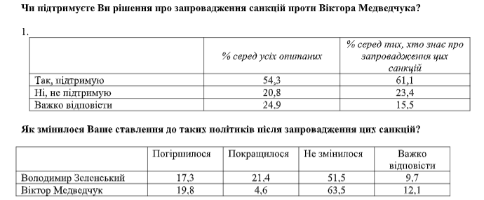Что же касается отношения граждан к санкциям против самого Виктора Медведчука, 45% опрошенных ответили, что хорошо знают об этих санкциях, еще 41,5% - "кое-что слышали об этом", а 13% - что "впервые о них слышат".