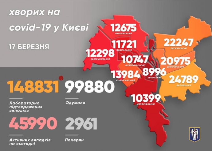 За все время пандемии в столице Украины в целом обнаружили коронавирус у 148 831 жителя, из них 2 961 больной умер, а 99 880 киевлян выздоровели.