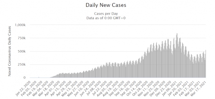 За сутки 16 марта в мире обнаружили 528 845 новых больных COVID-19 - это самый высокий показатель с 30 января, когда сообщалось о 529 999 больных.