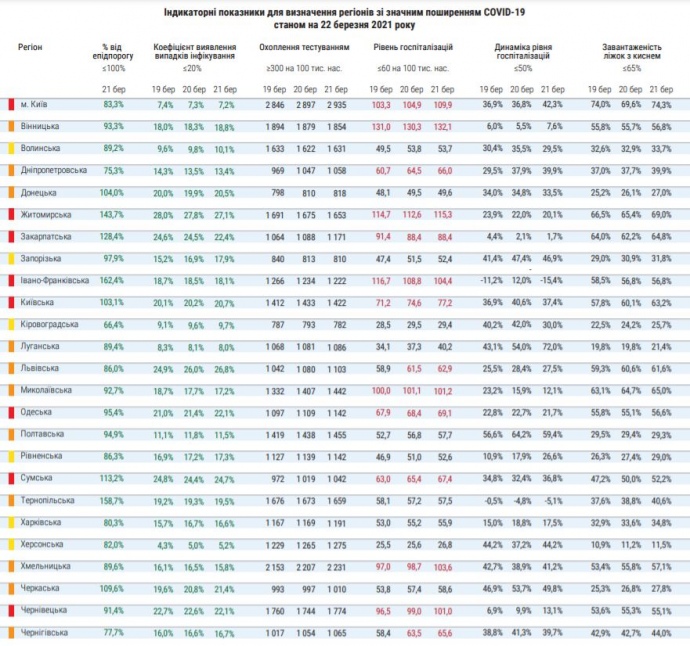 По состоянию на 22 марта в Украине 7 областей и столица Киев попали в "красную" зону по показателям распространения коронавируса.